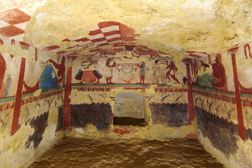 Nella Necropoli dei Monterozzi a Tarquinia, la presenza di pitture è così estesa da costituire un fattore di eccezionale importanza, permettendo di capire l’evoluzione di questa civiltà: qui entriamo nelle loro case, li osserviamo mentre mangiano, intenti a banchettare, sdraiati su klinai, mentre i musici suonano e gli schiavi nudi servono le vivande; le pitture fotografano la vita reale del popolo etrusco e accompagnano il defunto nel suo percorso ultraterreno.