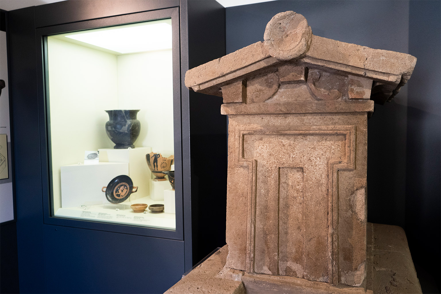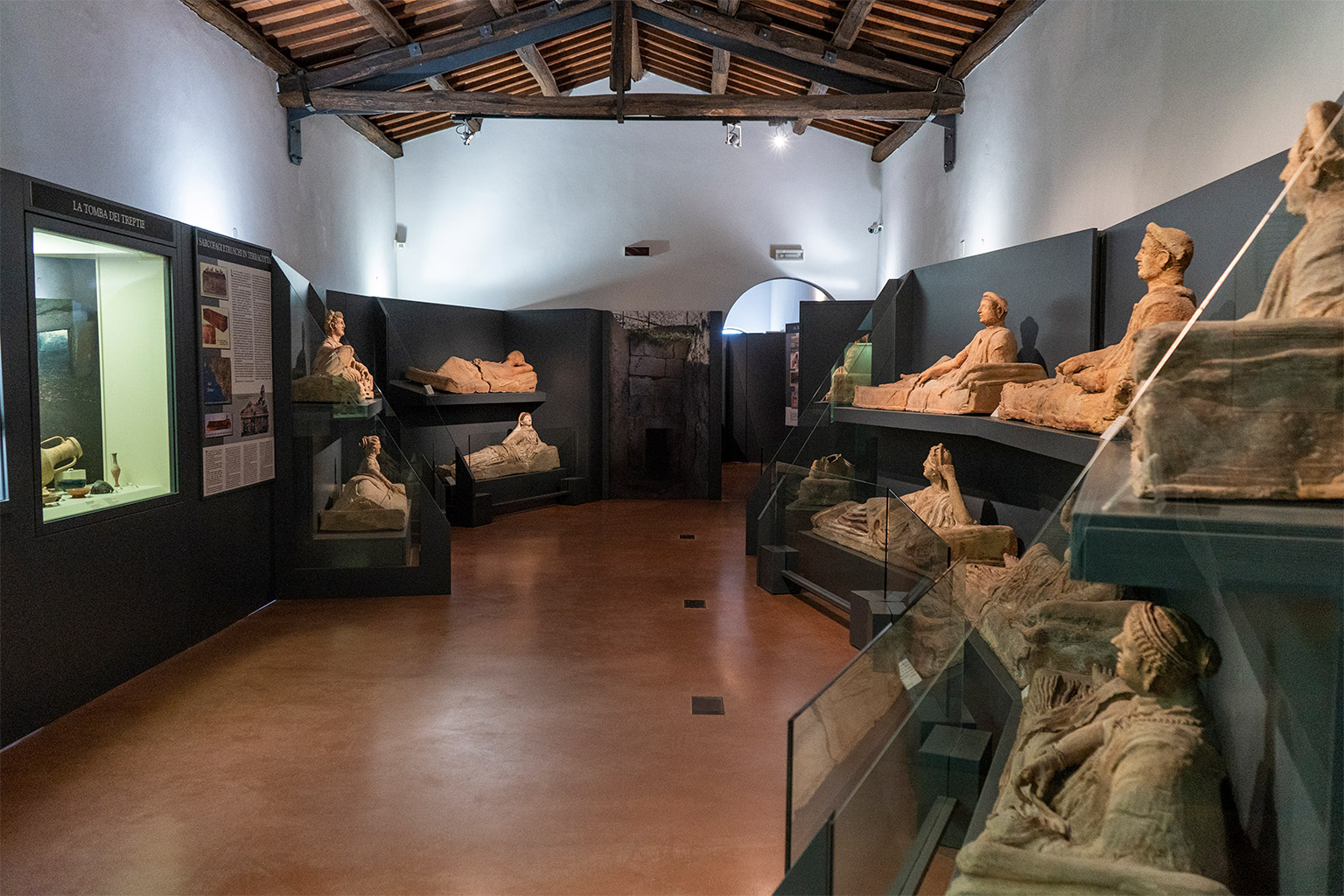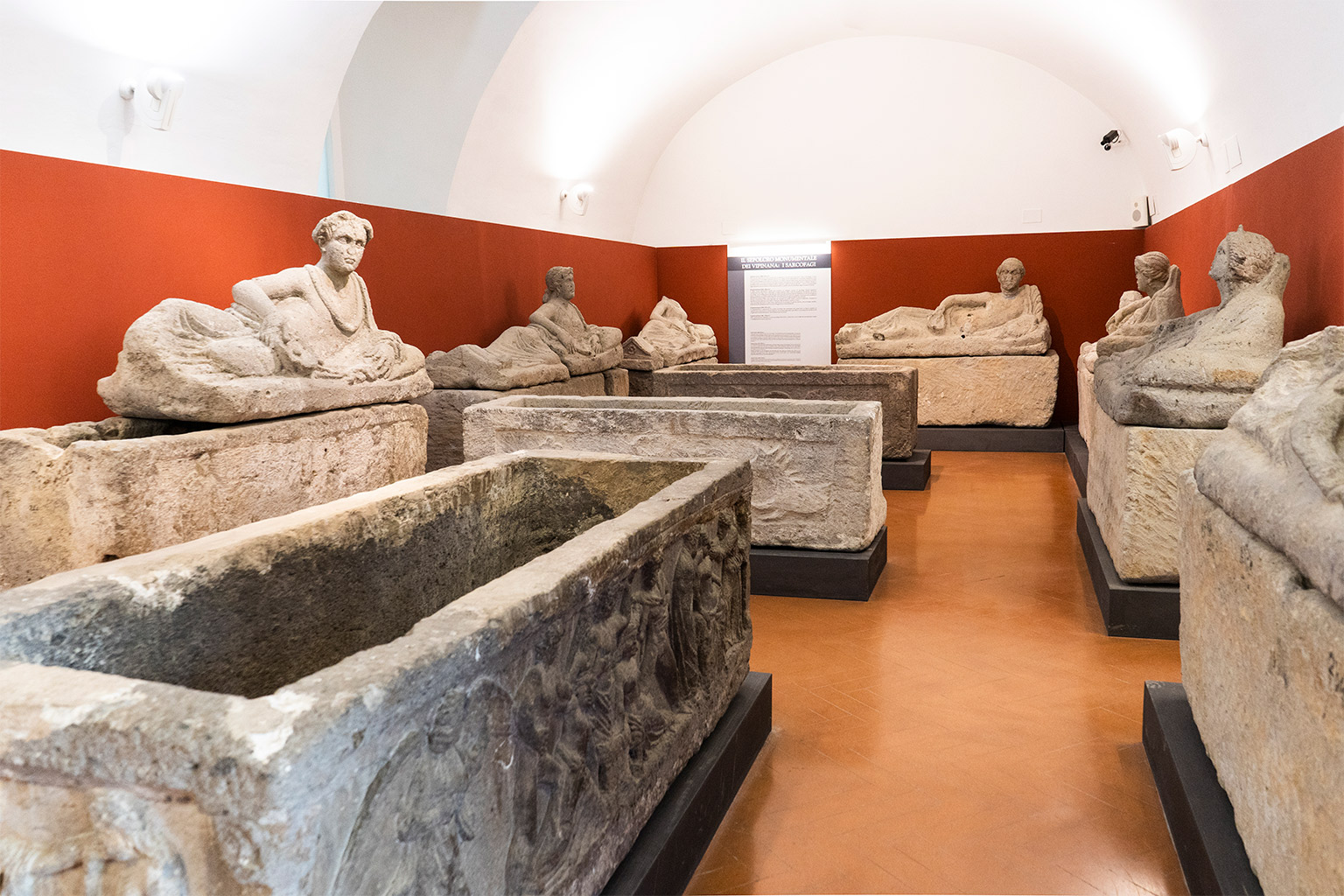 Il Museo conserva straordinarie testimonianze sepolcrali etrusche e romane della zona. Una prima sezione si trova ospitata già al piano terreno con reperti provenienti della necropoli Madonna dell’Olivo e Carcarello che accolgono un sarcofago appartenente alla famiglia Curunas.