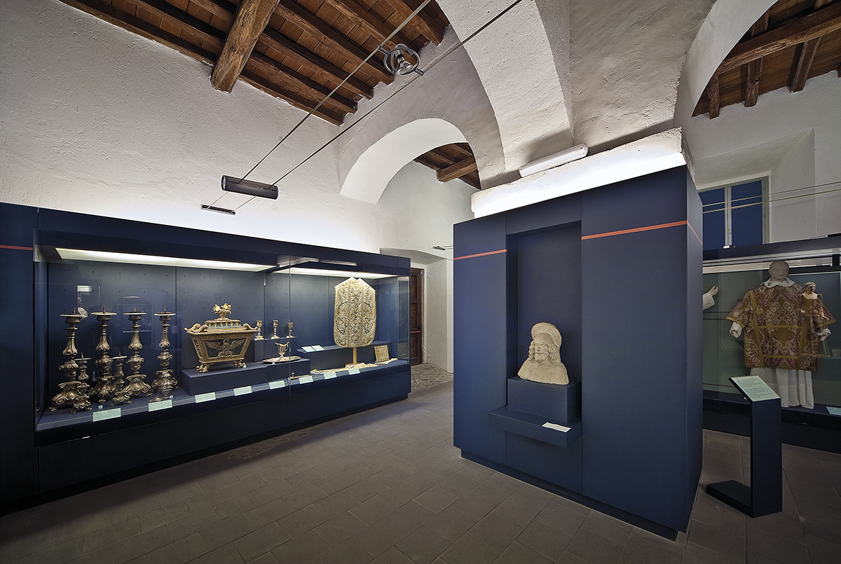 Di particolare importanza il busto di Cristo attribuito alla cerchia di Andrea Bregno, datato alla fine del XV secolo. Nella vetrina ad isola, esposto su manichini resi parlanti da un dispositivo multimediale, un parato in terza del 1732 e, sul retro, un bellissimo piviale della prima metà del XVII secolo recante lo stemma della famiglia Pamphilj.