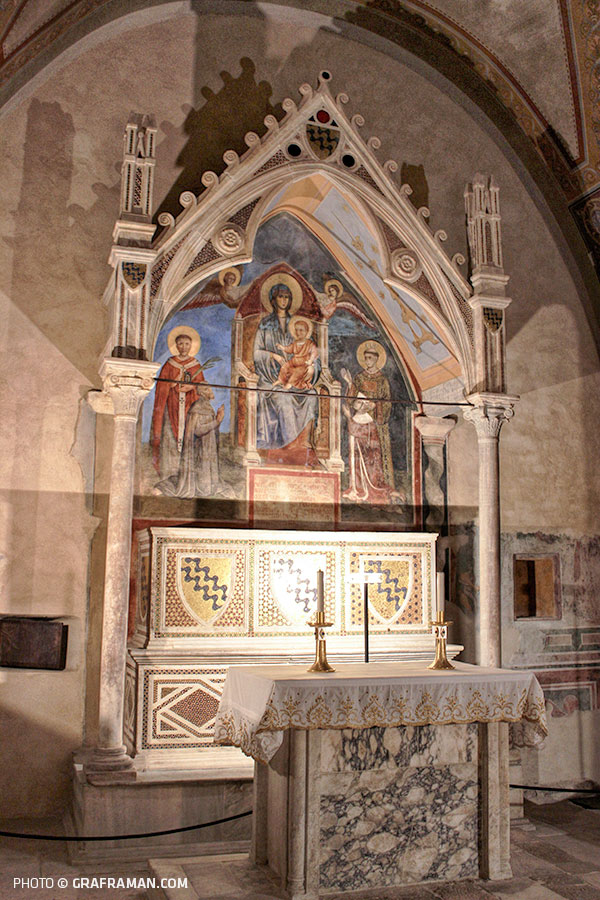 Segue la medievale Cappella del Salvatore. Sulle pareti della Cappella è presente un palinsesto decorativo, che evidenzia tre fasi successive di decorazione, per un arco temporale, del XII e del XV secolo; nella sala sono conservati anche oggetti lignei di particolare pregio. La Cappella Caetani venne costruita per celebrare il duplice potere temporale e spirituale di Bonifacio VIII. I sarcofagi per la sepoltura sono due; l’affresco che decora la parete del ciborio è della fine del Trecento. Anche se fortemente rimaneggiata l’iscrizione sotto il primo sarcofago ci informa che in esso è contenuto il corpo di Pietro, maestro di Bonifacio VIII, fino ad arrivare ai sotterranei della Cattedrale. L’Ambulacro è un ambiente di passaggio tra l’Oratorio di San Thomas Becket e la Cripta di San Magno. Il primo è un antico mitreo del I-II secolo d.C. La volta sull’altare è composta da tre rappresentazioni, di cui la terza appunto è dedicata al martirio del santo, mentre nella quarta scena si intravede il primo miracolo realizzato dal Santo. Sulla volta della navata e sulla parete di sinistra troviamo la Genesi e scene del Nuovo Testamento. La cripta di San Magno è stata costruita con l’obiettivo di fingere da scrigno alle reliquie dei santi.